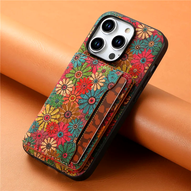 Crafted from premium vegan leather with a hand-printed, rich bohemian-inspired pattern. This iPhone case features a soft exterior for a secure grip with a built-in wallet that holds up to 5 cards, while a magnetic closure keeps everything in place. A fold-out flap doubles as a dual-angle stand for calls, videos, or hands-free work.