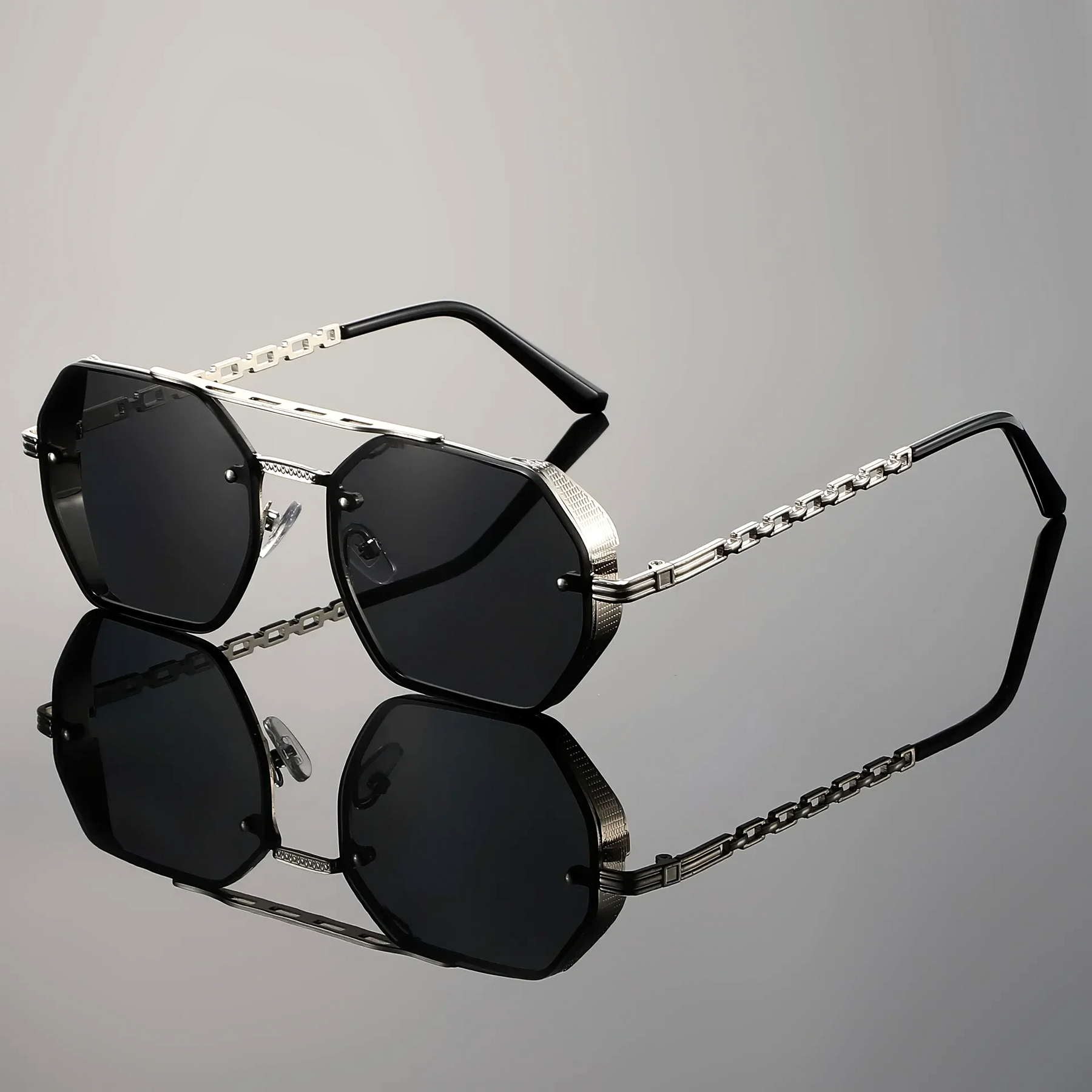 Oversized pilot frames with sharp lines, a dual bridge, and chain-link temples, these sunglasses are a modern twist on vintage pilot frames.