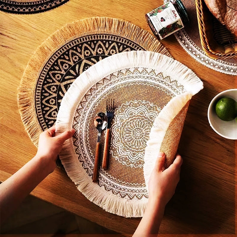 Bring ravishing rustic elegance to the party table this festive season with eclectic boho placemats. Featuring high-quality jute construction with fringed tassel edge, these round placements are a perfect tabletop décor accent for your barn-style events, farm weddings, rustic theme parties, and weddings.