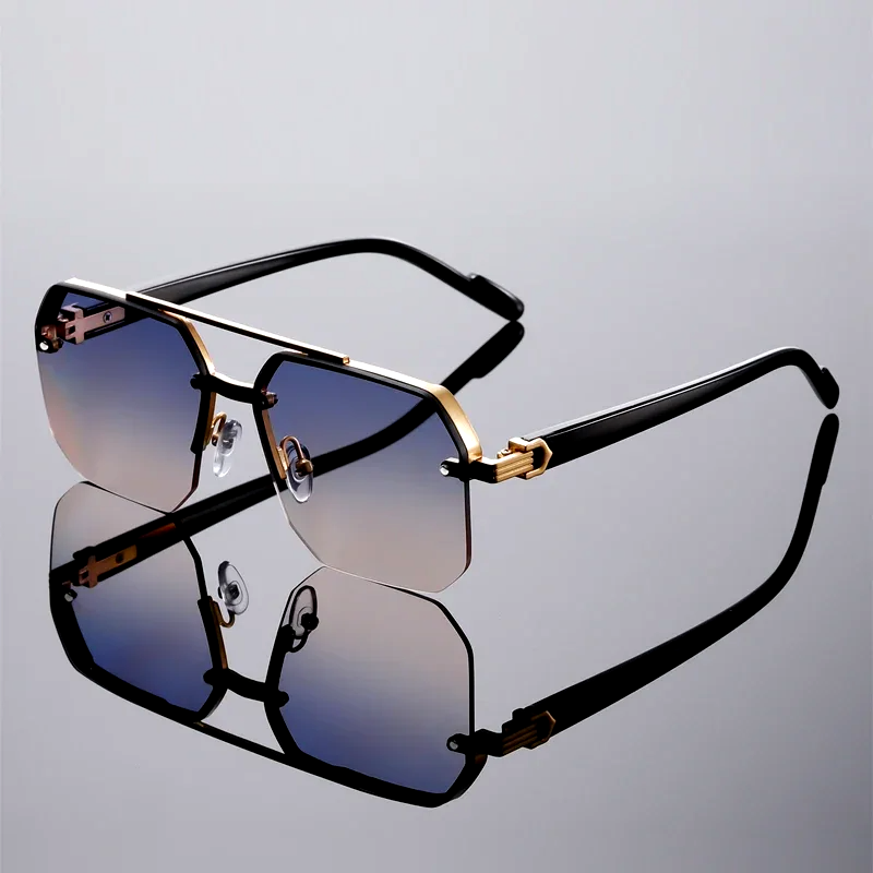 Sculpted for distinction, these rimless geometric sunglasses pair sharp angles with a sleek double bridge and subtle gradient lenses. A timeless piece reimagined for today.